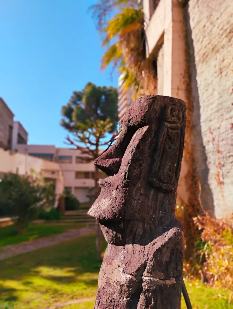 Este verde espacio cuenta con tres araucarias, palmeras, y buganvilias, entre otras especies. Una de las curiosidades es la presencia de un moai de piedra en el jardín. El origen de esta escultura se relaciona con un proyecto de apicultura de Caritas Chile en Isla de Pascua, el cual motivó en 1997 una visita del padre Santi a este territorio insular. Allí fue contactado por un artesano en piedra quien, a modo de agradecimiento por esa visita y los proyectos realizados en pos de la isla, decidió tallar una réplica a menor escala de los moais ancestrales. Este fue enviado por barco y luego trasladado a Santiago, específicamente al Ágora, implicando una importante gestión logística y la colaboración de muchas personas para lograr instalarlo en el lugar que hoy ocupa.