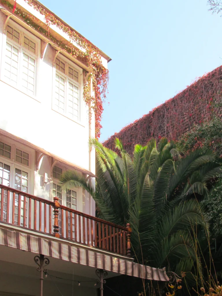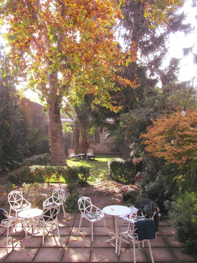 El jardín es de uso exclusivo de los huéspedes -¡qué suerte tienen!-, pero en ocasiones también acoge eventos sociales o artísticos, e íntimos matrimonios. El luminoso y silencioso espacio, desde el que se tiene una vista única del edificio, está compuesto por una terraza rodeada por arbustos de pequeña y mediana altura, y enmarcada por una balaustrada del nivel que conecta al restobar y salón de estar del hotel. El fondo del jardín invita al relajo de los huéspedes con unas reposeras bajo el follaje de palmeras, un plátano oriental y una araucaria centenaria. En el deslinde poniente, a través de la vegetación, se puede entrever un muro de albañilería por el cual trepa una enredadera hasta el techo del edificio.